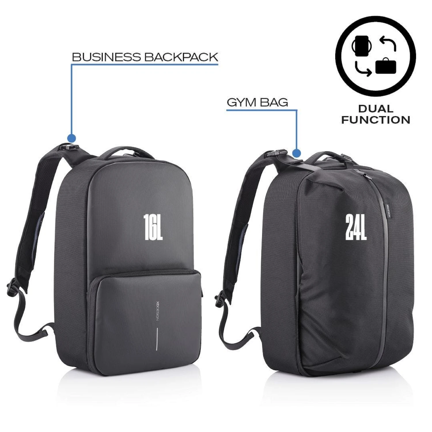 Flexible and practical, the XD Design Flex Gym bag is the first business backpack and gym bag in only one gear. Quickly convert this backpack from business to gym style, just expanding the front pocket, from 16 to 24 Liters.