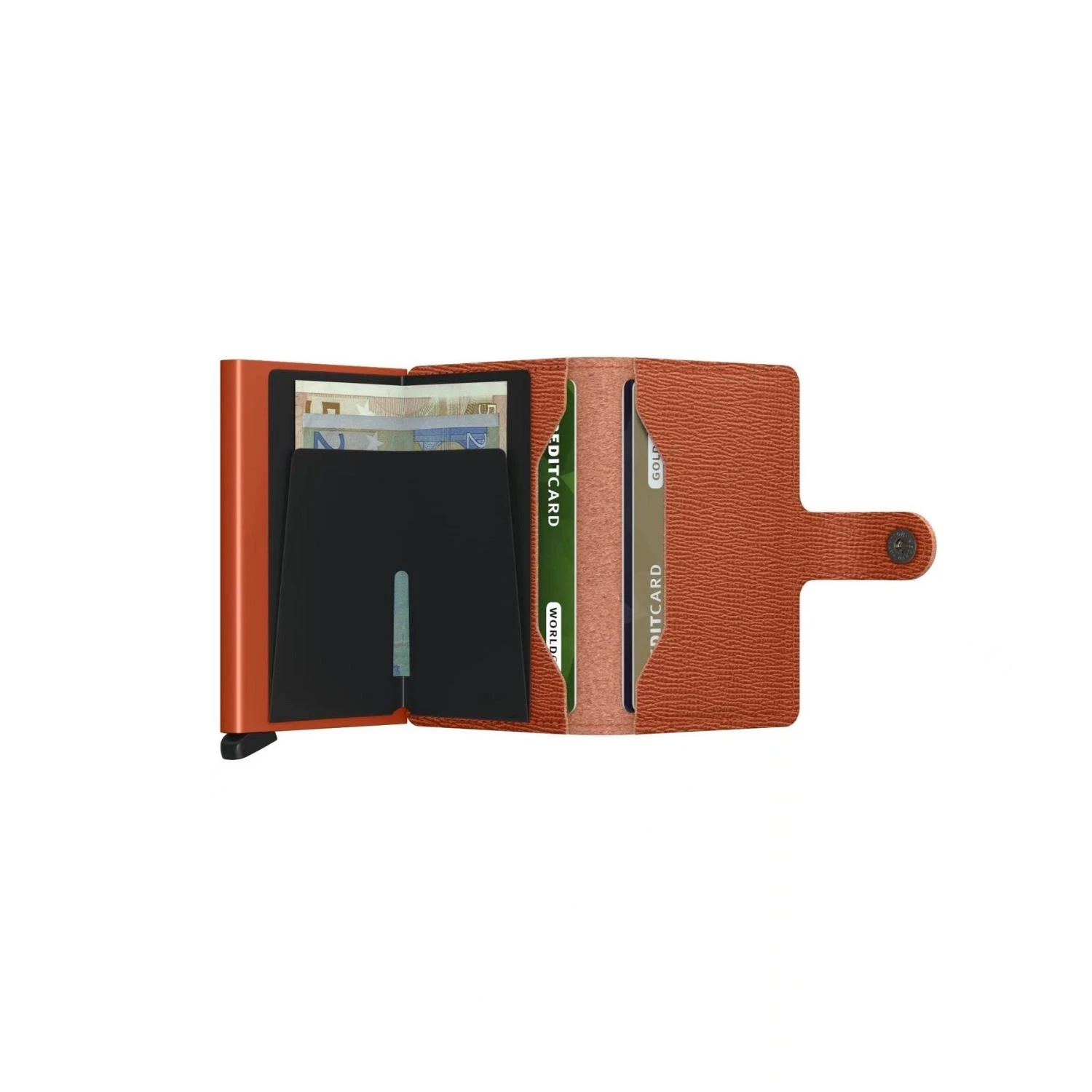 Small in size and surprisingly large in storage capacity, the Miniwallet combines the best of both worlds. The exterior holds banknotes, receipt and cards, while the aluminium Cardprotector allows you to slide out cards with one simple motion and protects them from bending, breaking and unwanted wireless communication.