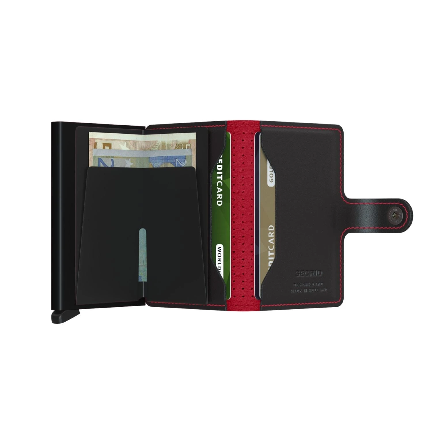 Small in size and surprisingly large in storage capacity, the Miniwallet combines the best of both worlds. The exterior holds banknotes, receipt and cards, while the aluminium Cardprotector allows you to slide out cards with one simple motion and protects them from bending, breaking and unwanted wireless communication.
