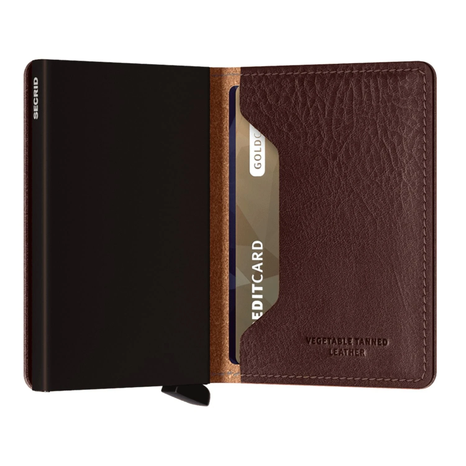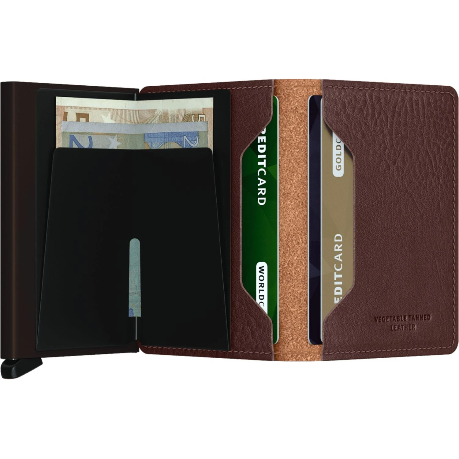 Each Slimwallet has the aluminum Cardprotector inside. The patented mechanism provides a simple and fast access to your cards. Push the lever and the cards slide out smoothly, ready for immediate use. The strong case protects the cards against bending, breaking and unauthorised wireless scanning.